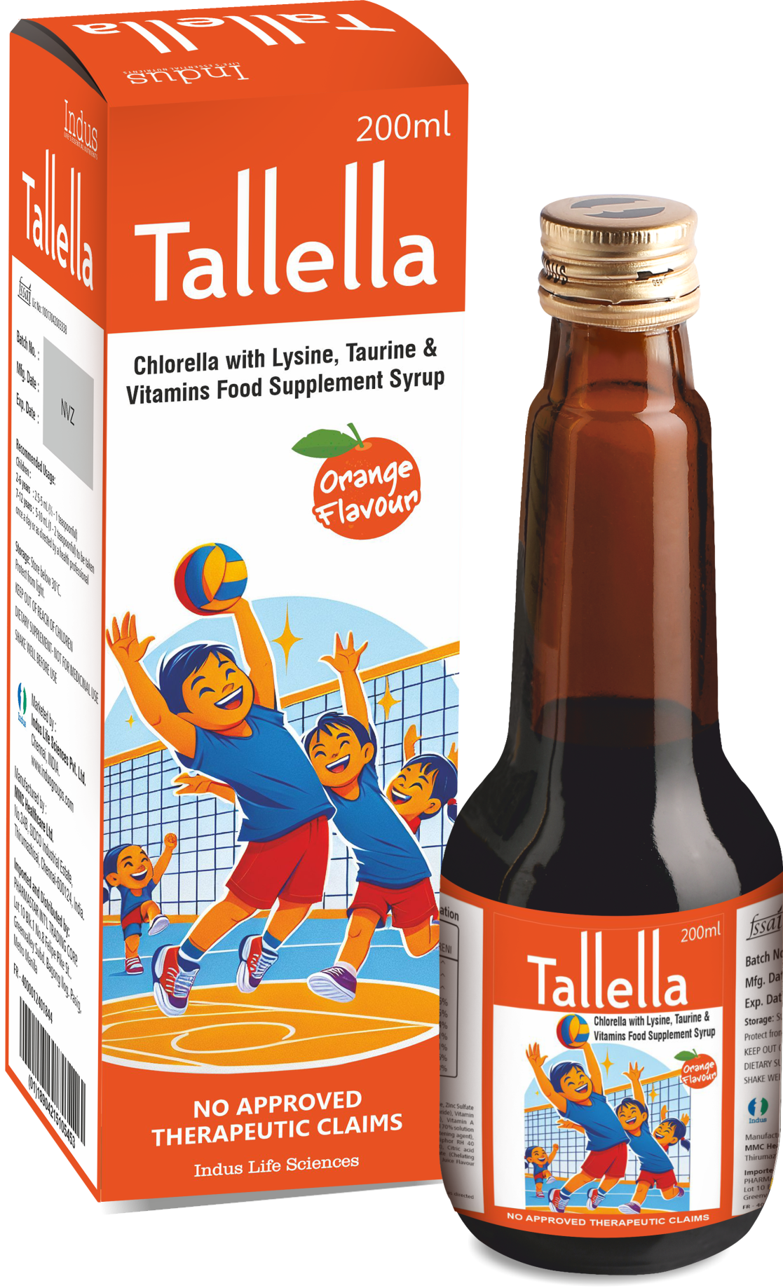 Tallela is a children's nutritional supplement designed to support growth and cognitive development. It contains Chlorella Growth Factor (CGF), Zinc, Lysine, Taurine, and Multivitamins.